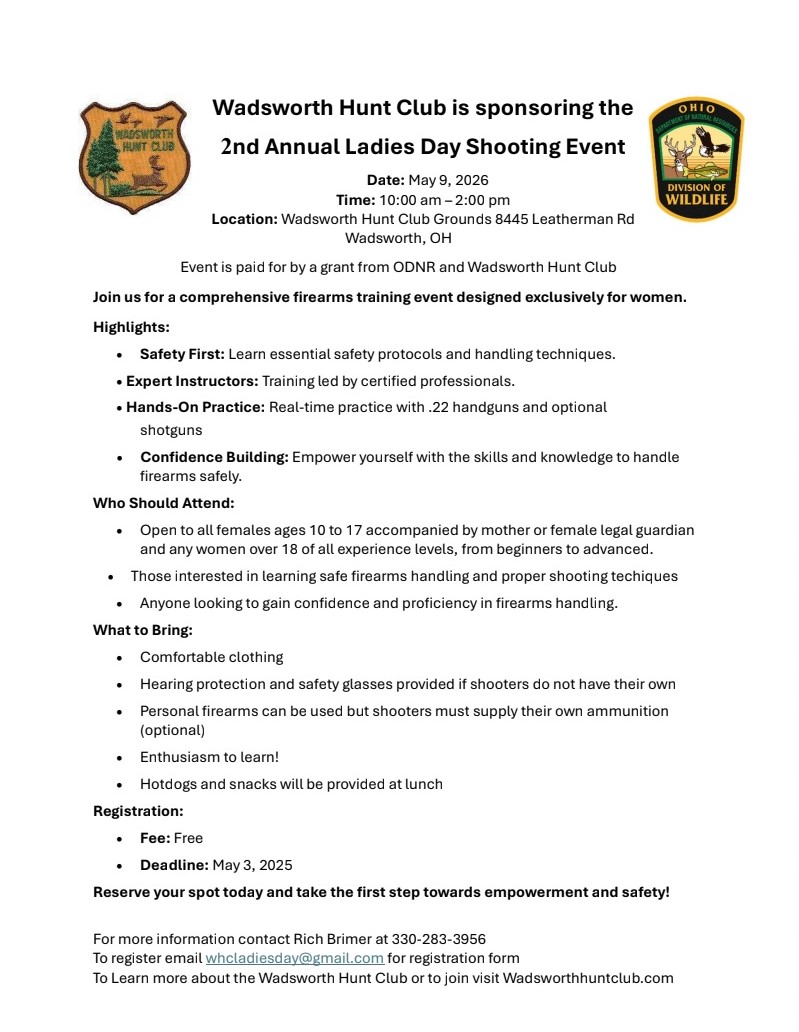 Hosted by the Wadsworth Hunt Club, this Ladies-Only event provides a safe, supportive, and encouraging environment for every lady to obtain the knowledge, skills, and attitude necessary for safe gun handling. Whether you are a seasoned shooter or have never held a firearm before, this event is for you!